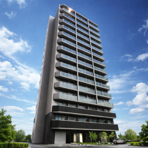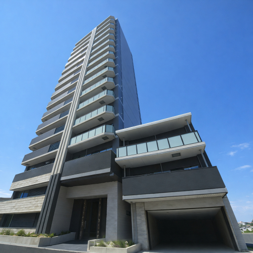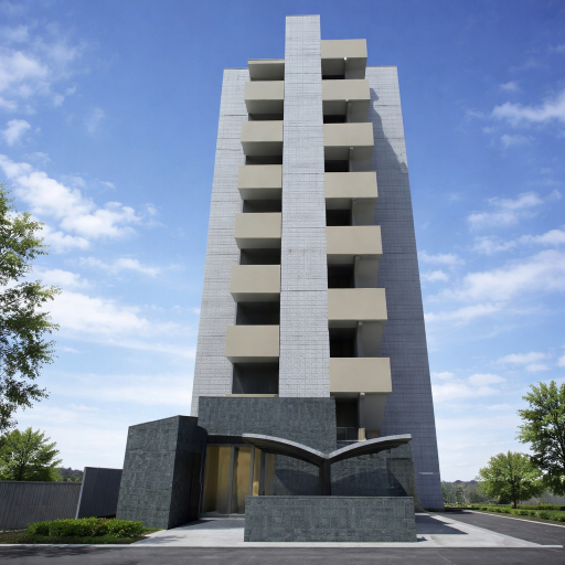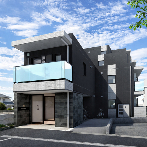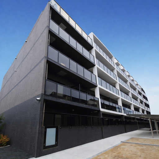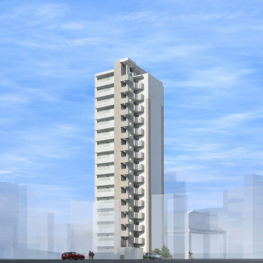 総戸数55戸磁器質タイルとコンクリート打ち放し風仕上げ。2つのテイストの縦ラインが心地よいリズムを刻み、シャープなガラスのバルコニー手摺と調和して現代的で洗練された表情を醸し出すファサード。